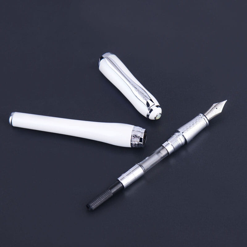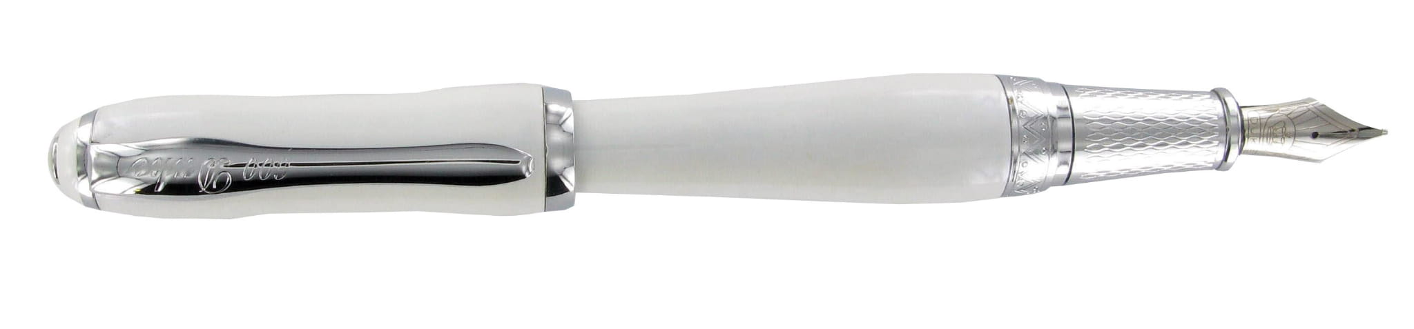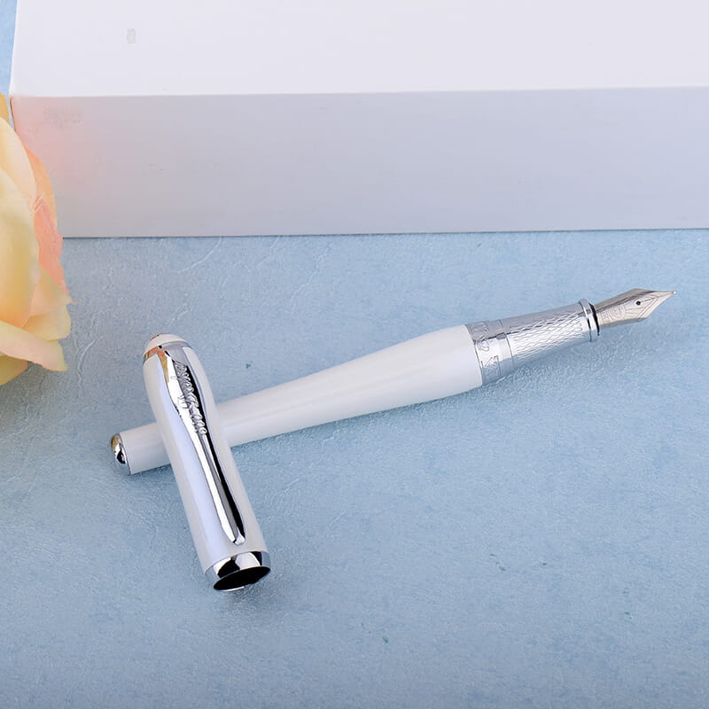 Kolekcja Duke Chast Lady to propozycja piór dla pań. Wykonane z mosiądzu lakierowane lśniącym lakierem w żywych kolorach, wykończone chromem zachwycają kobiecym kształtem. Korona skuwki zwieńczona masą perłową. Instrument urzeka dbałością o szczegóły, jakością wykonania i komfortem użytkowania. Doskonałe na prezent dla pań. Wersja w kolorze lśniącej bieli. Pióro wieczne wyposażone w konwerterowy system napełniania z możliwością wymiany na naboje atramentowe. Stalówka grawerowana wykonana ze stali szlachetnej w rozmiarze F. Dane techniczne pióra: zamknięte 13,6 cm; otwarte ze skuwki 14,3 cm; otwarte bez skuwki 12,0 cm; skuwka 5,4 cm. Etui standardowe prostokątne powlekane welurem w kolorze zielonym, wyściełane pluszową gąbką z zamknięciem. Wymiary: (szerokość x głębokość x wysokość) 16,0 cm x 8,0 cm x 4,0 cm.