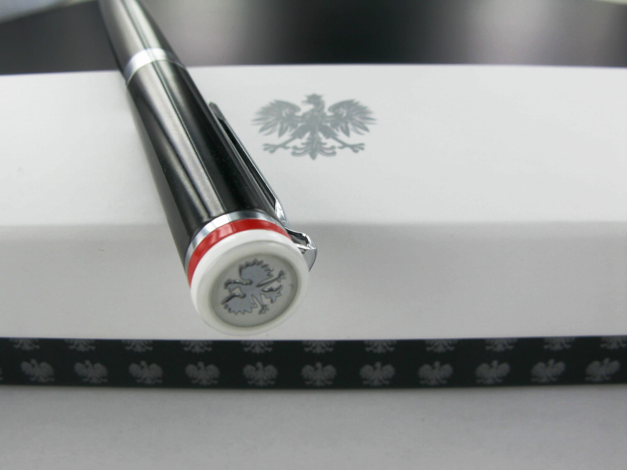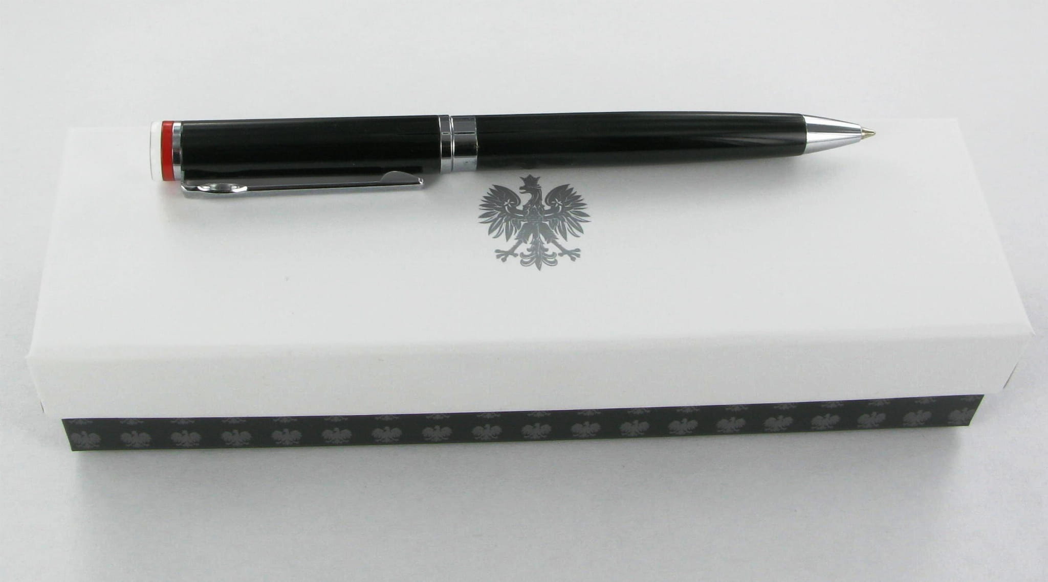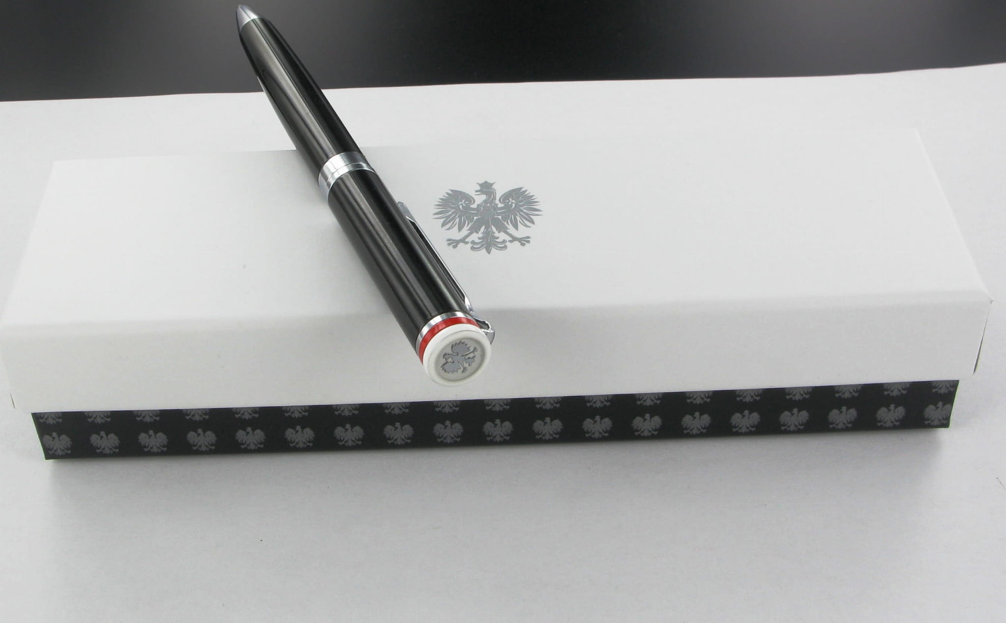 Duke P3 to instrument piśmienny o klasycznym kształcie wykonany z mosiądzu pokrytego czarnym, błyszczącym lakierem.Czarny korpus i skuwka, chromowane wykończenia, korona skuwki zwieńczona biało-czerwonym otokiem, na szczycie umieszczone wizerunek orła. Długopis typu twist Duke P3 przystosowany do wkładów do długopisów Duke. Etui tekturowe ekologiczne, wyściółka tekturowa czarna o wymiarach: (szerokość x głębokość x wysokość) 17,5 cm x 3,5 cm x 5 cm. Wymiary długopisu 13,5cm.