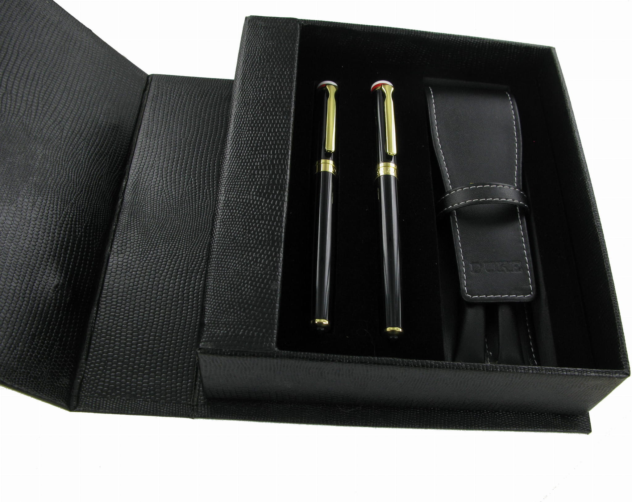 Całość zapakowana jest w eleganckie, czarne kartonowe etui, wyściełane ciemną, pluszową gąbką, która doskonale chroni instrumenty. W zestawie znajduje się również dodatkowe etui z ekologicznej skóry z białymi przeszyciami, mieszczące dwa instrumenty piśmiennicze, co czyni ten zestaw idealnym na prezent.