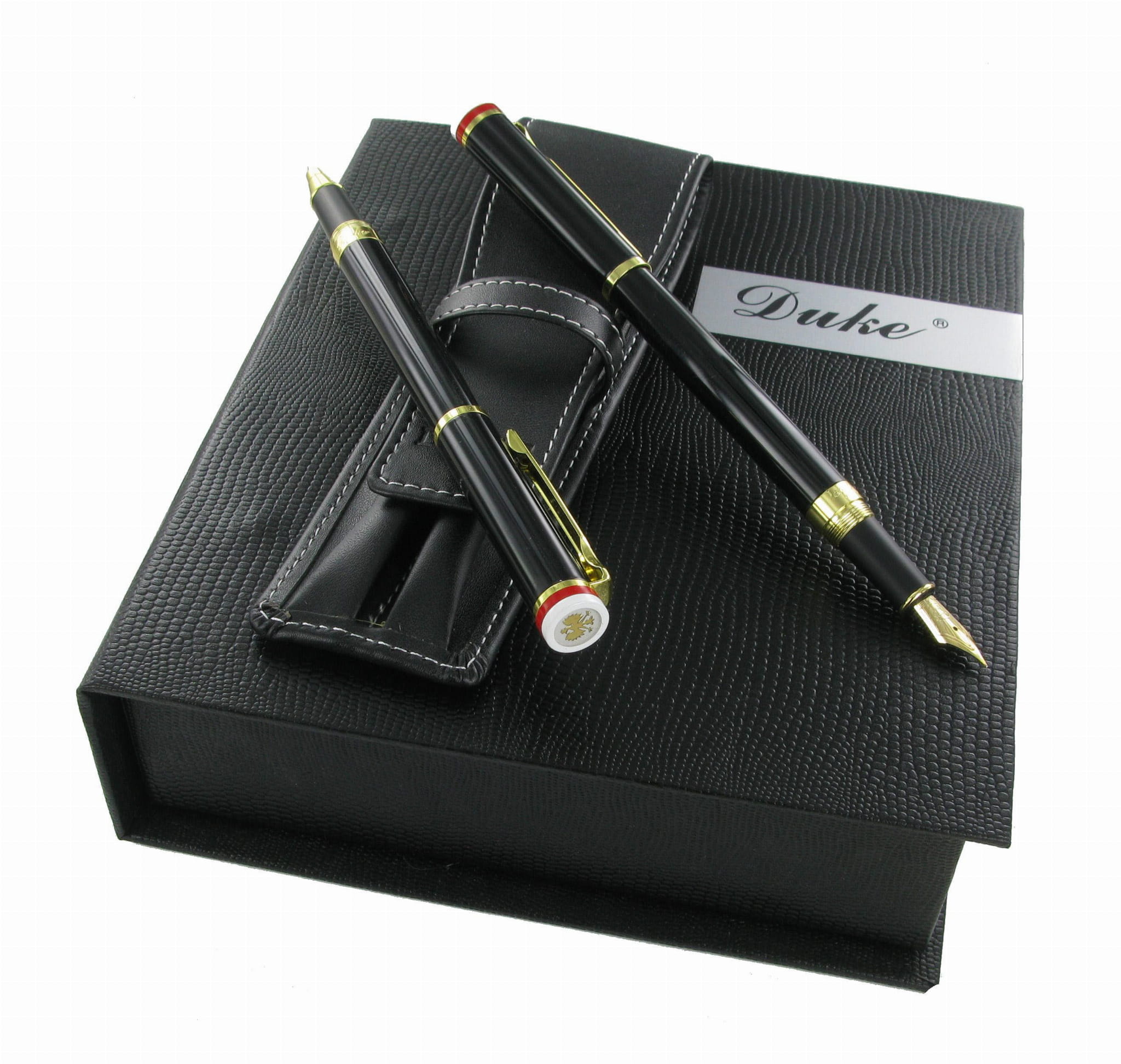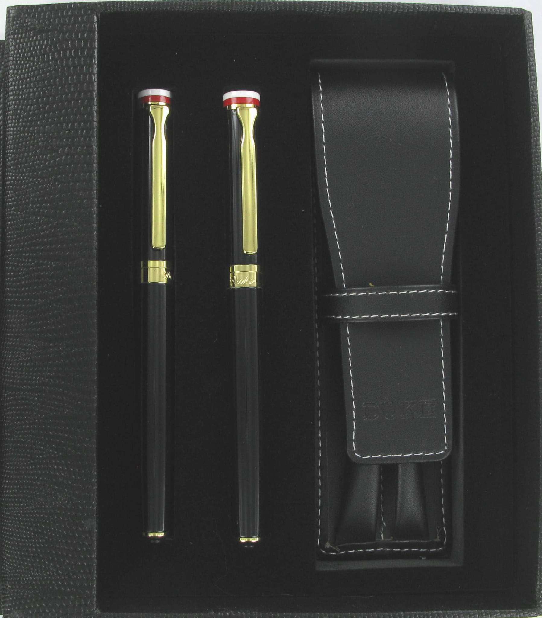 Duke P3 to eleganckie instrumenty piśmiennicze o klasycznym kształcie, wykonane z mosiądzu pokrytego czarnym, błyszczącym lakierem. Wykończenia w kolorze złotym oraz korona skuwki ozdobiona biało-czerwonym otokiem dodają im wyjątkowego charakteru. Na szczycie pióra znajduje się symbol orła, co podkreśla jego prestiżowy wygląd.