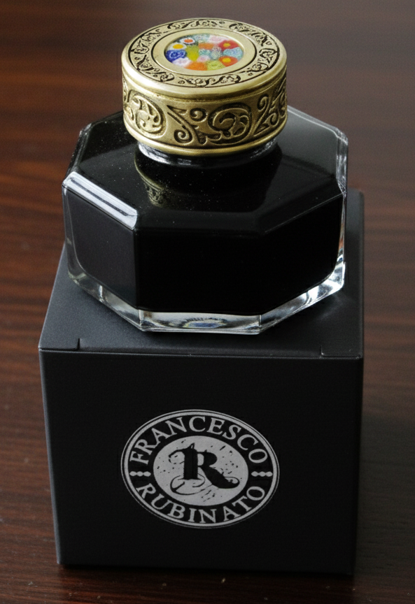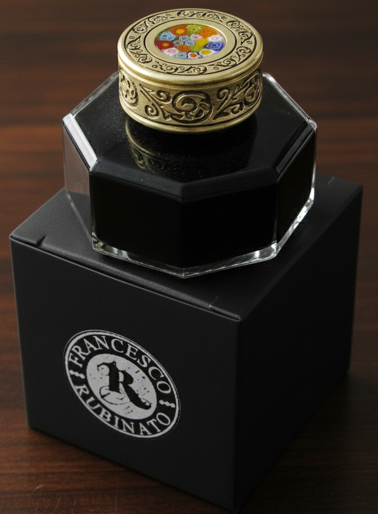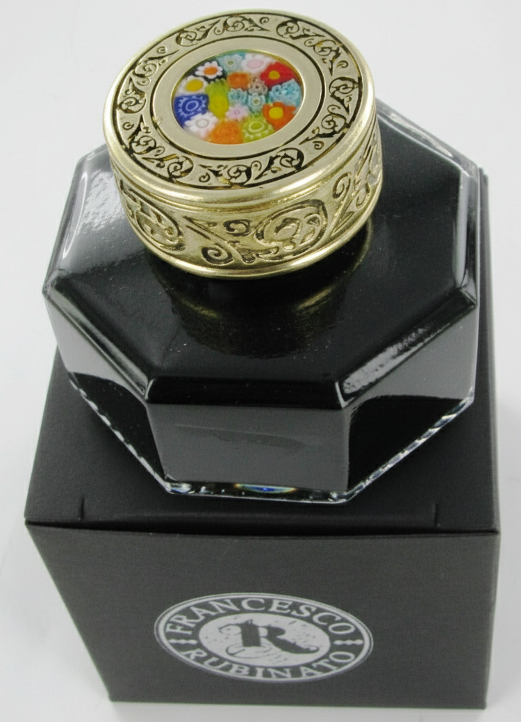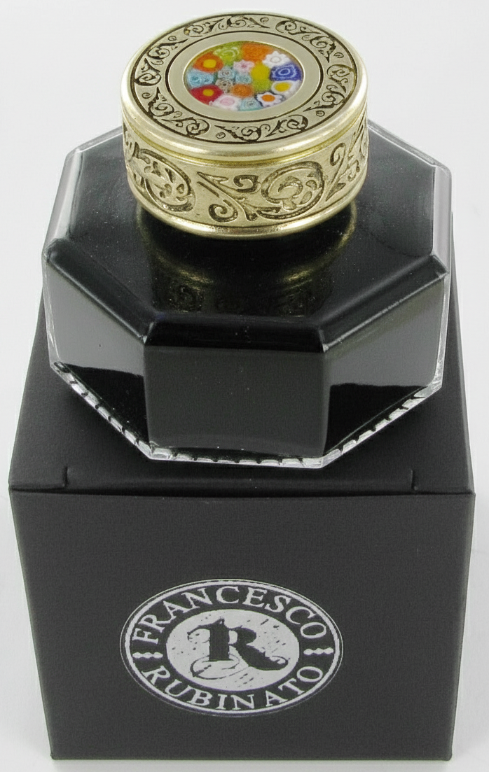 Czarny atrament, który wypełnia kałamarz, nadaje mu tajemniczy charakter, a zamknięcie z elementem dekoracyjnym Murrina z Weneckiej wyspy Murano dodaje mu niezwykłego uroku.