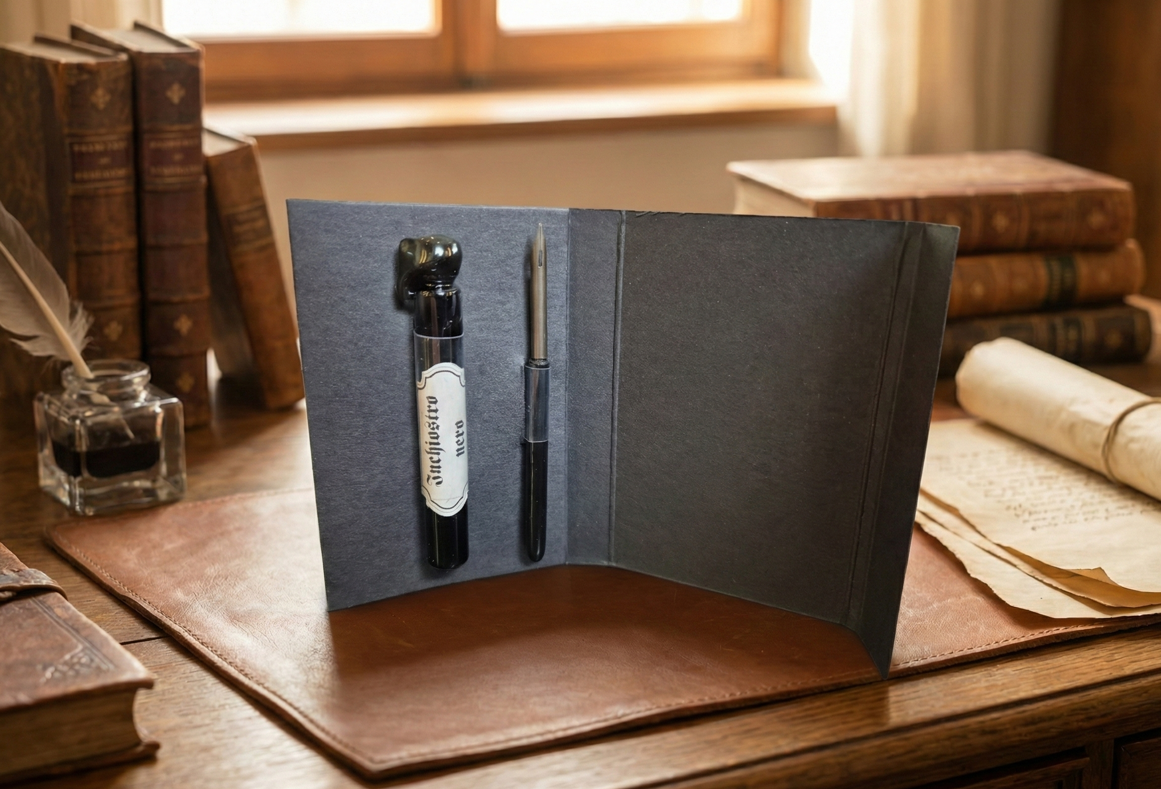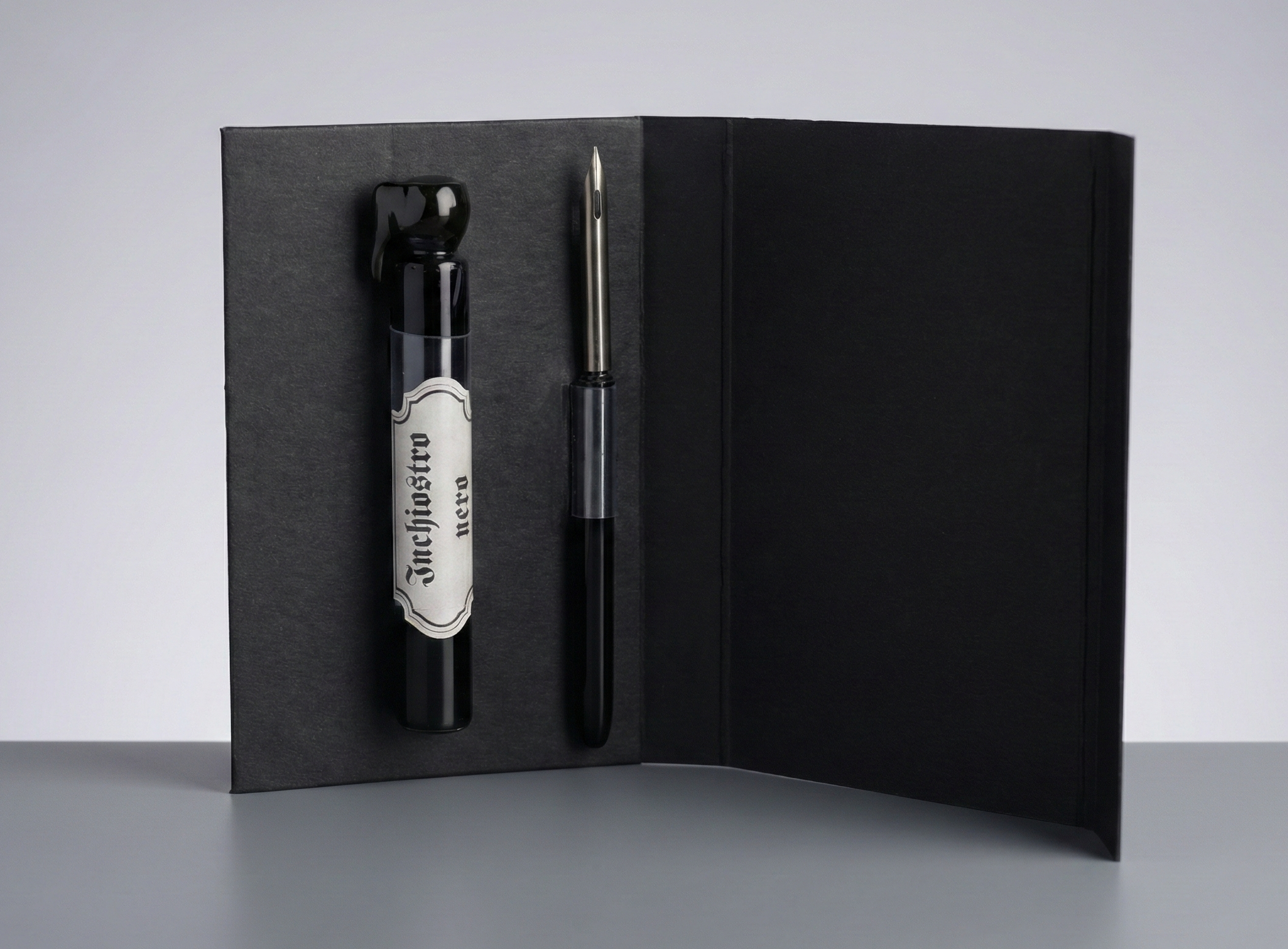 Zestaw składa się z dwóch elementów niezbędnych do tradycyjnego pisania: szklanej fiolki z czarnym tuszem "Inchiostro nero" oraz klasycznego pióra maczanego ze stalówką. Doskonały jako podręczny przybornik do szkicowania tuszem lub pisania.