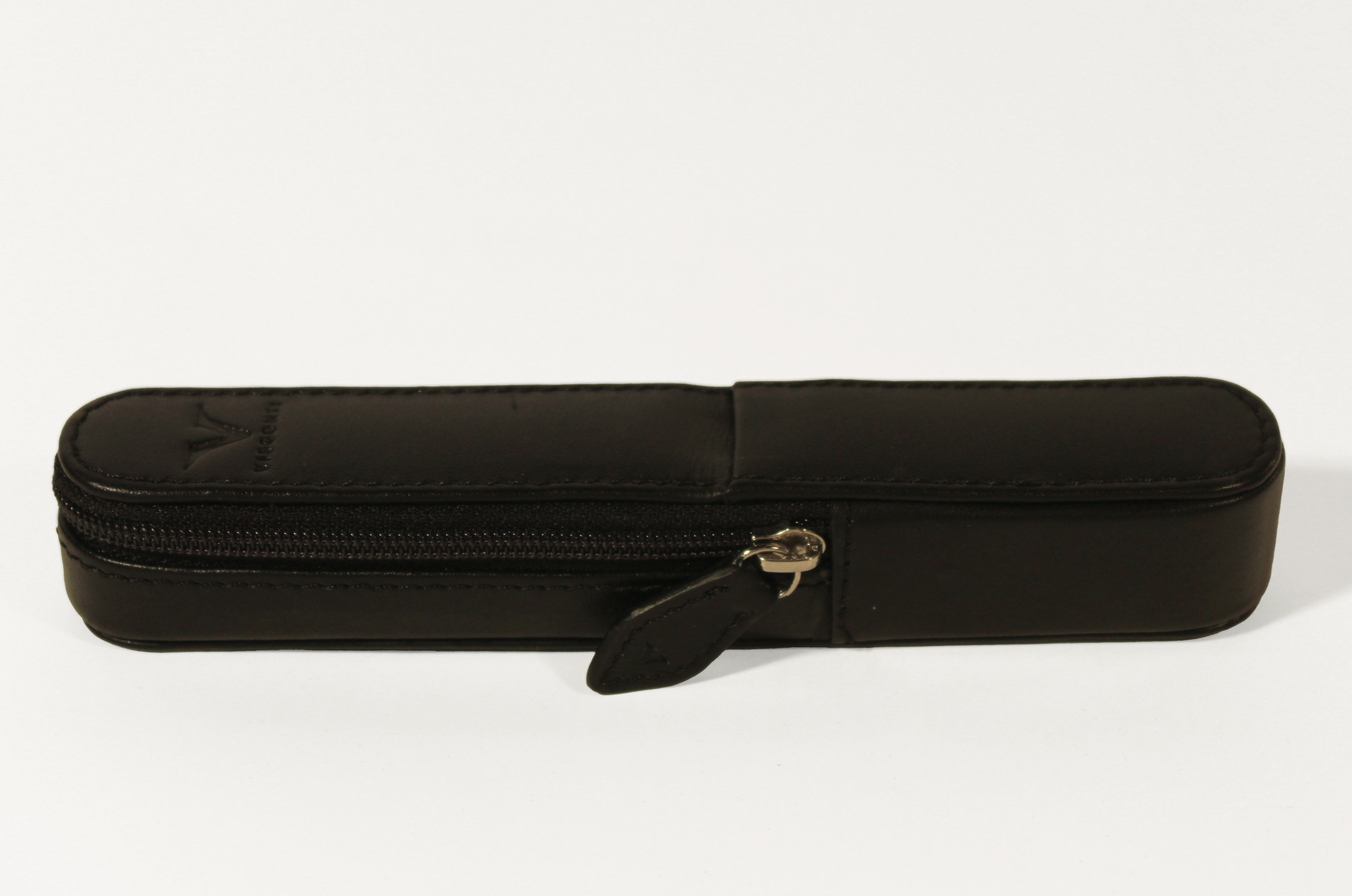 Etui na jedno pióro. Sztywne etui wykonane ze skóry naturalnej w kolorze czarnym. W środku wyściełane czarnym zamszem, przedzielone sztywnymi przegrodami. Zamykane na suwak. wymiary 25x160 mm