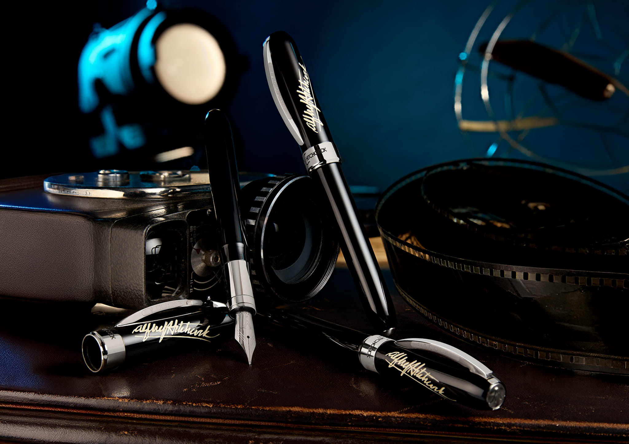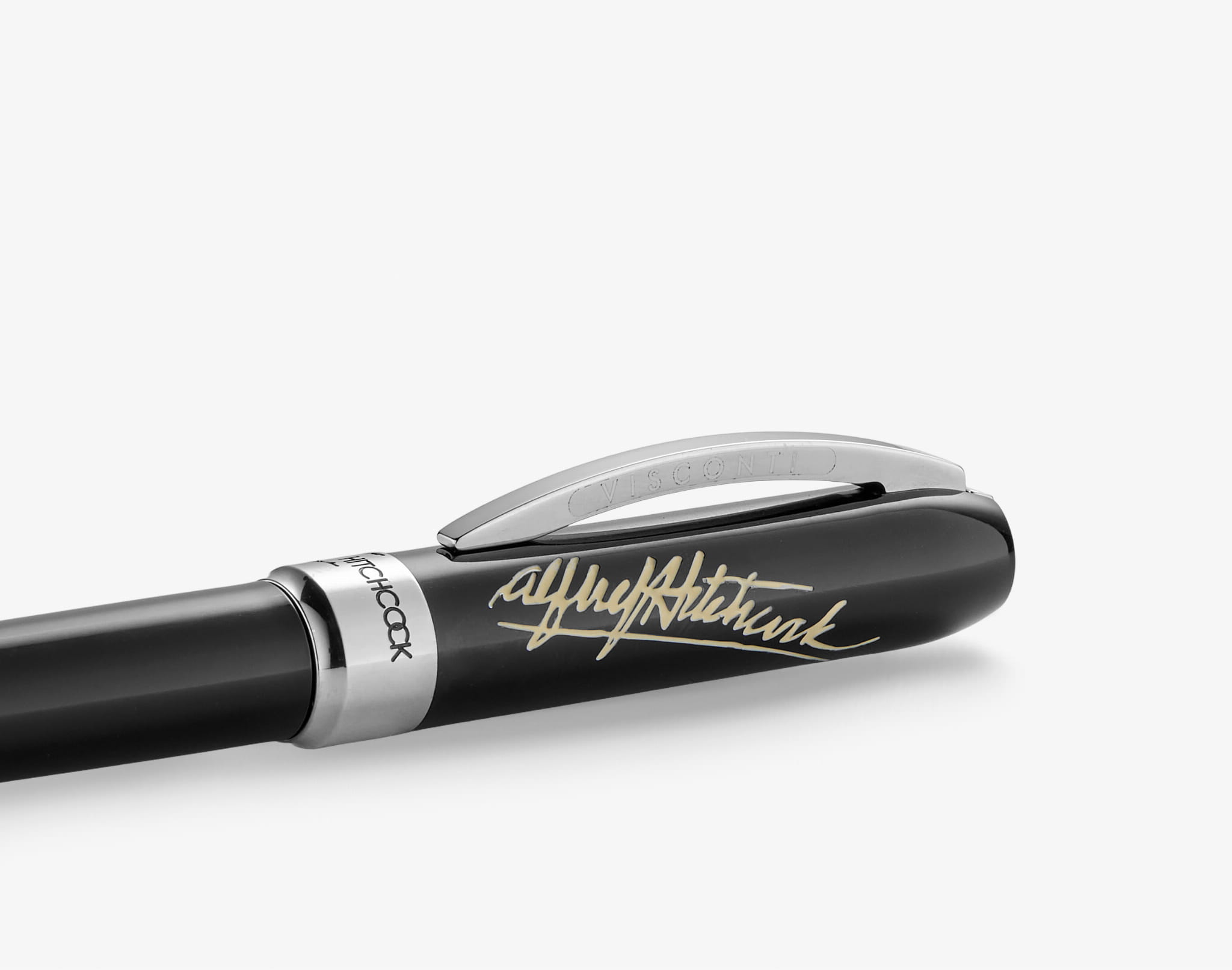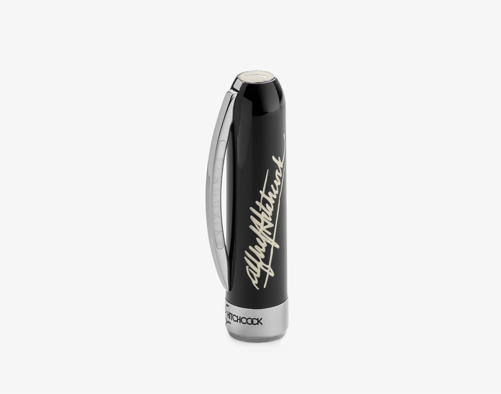 Elegancja w stylu retro i wizualne napięcie spotykają się w instrumencie piśmienniczym, który potrafi opowiedzieć znacznie więcej, niż tylko zapisać słowa. Kolekcja Hitchcocka dostępna jest w wersji pióra wiecznego, rollera i długopisu, a każdy z nich został stworzony, aby zapewnić płynne i inspirujące doświadczenie pisania. Design czerpie z estetyki lat 60. Lśniący czarny korpus z żywicy połączony z palladowymi wykończeniami tworzy wyszukany czarno-biały kontrast, nawiązujący do charakterystycznego stylu filmów Hitchcocka. Na skuwce znajduje się precyzyjnie emaliowana reprodukcja podpisu reżysera – hołd dla jego ikonicznej roli jako narratora i twórcy. Specjalnie zaprojektowana obręcz otacza pióro, prezentując zarówno logo Visconti, jak i legendarną sylwetkę Hitchcocka, będącą emblematem jego fundacji.