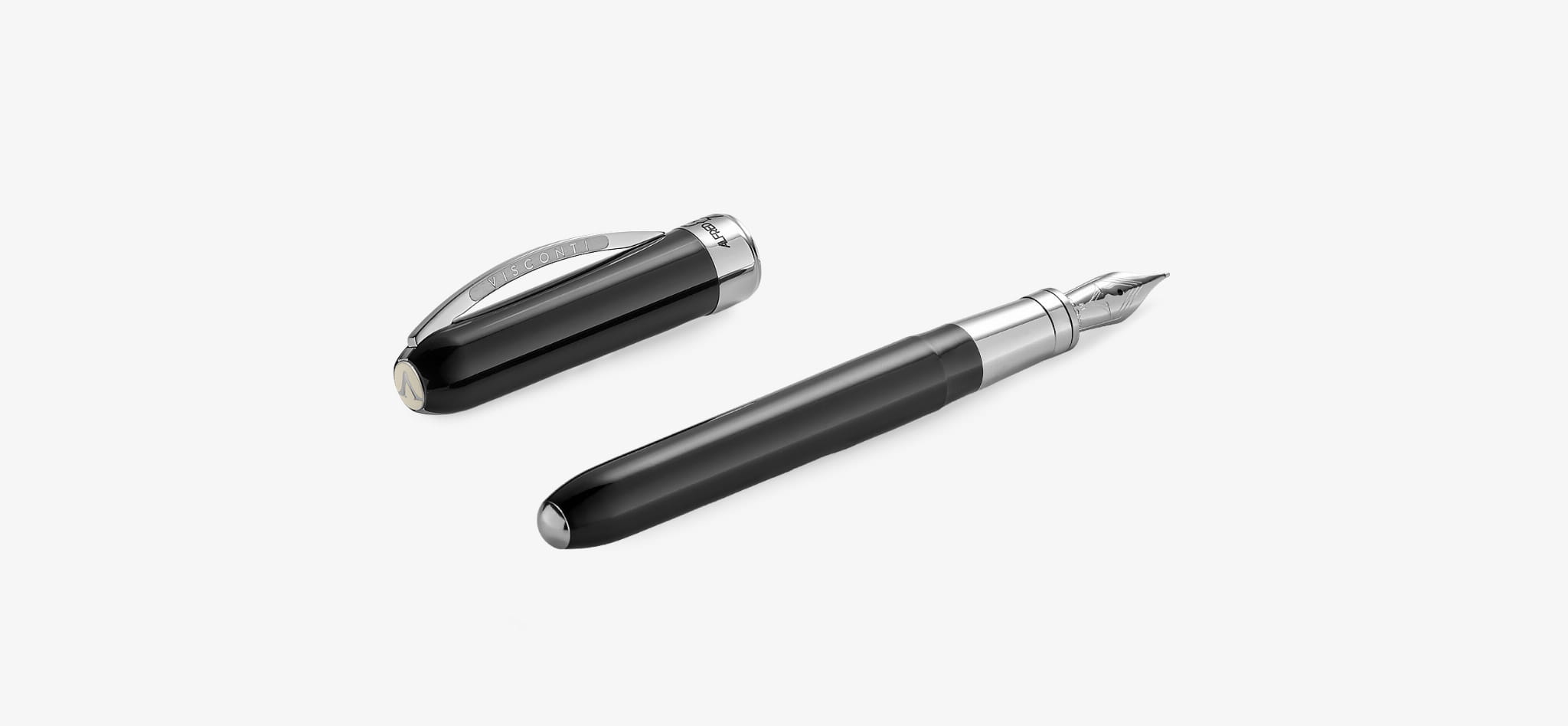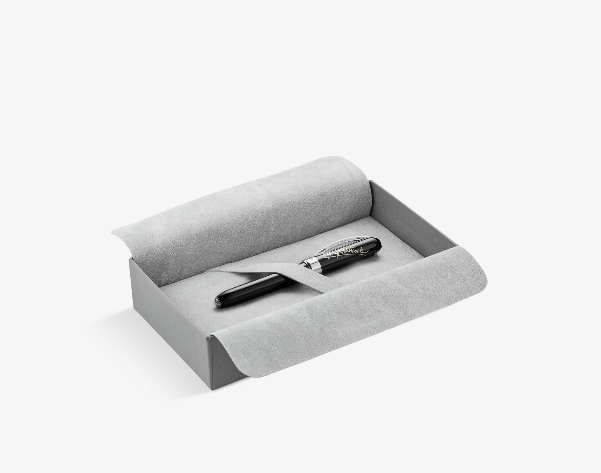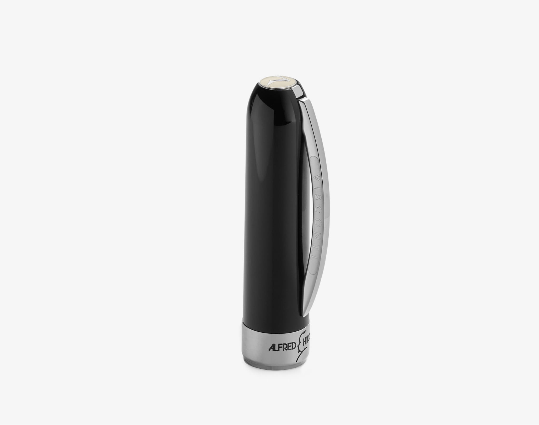 Elegancja w stylu retro i wizualne napięcie spotykają się w instrumencie piśmienniczym, który potrafi opowiedzieć znacznie więcej, niż tylko zapisać słowa. Kolekcja Hitchcocka dostępna jest w wersji pióra wiecznego, rollera i długopisu, a każdy z nich został stworzony, aby zapewnić płynne i inspirujące doświadczenie pisania. Design czerpie z estetyki lat 60. Lśniący czarny korpus z żywicy połączony z palladowymi wykończeniami tworzy wyszukany czarno-biały kontrast, nawiązujący do charakterystycznego stylu filmów Hitchcocka. Na skuwce znajduje się precyzyjnie emaliowana reprodukcja podpisu reżysera – hołd dla jego ikonicznej roli jako narratora i twórcy. Specjalnie zaprojektowana obręcz otacza pióro, prezentując zarówno logo Visconti, jak i legendarną sylwetkę Hitchcocka, będącą emblematem jego fundacji.